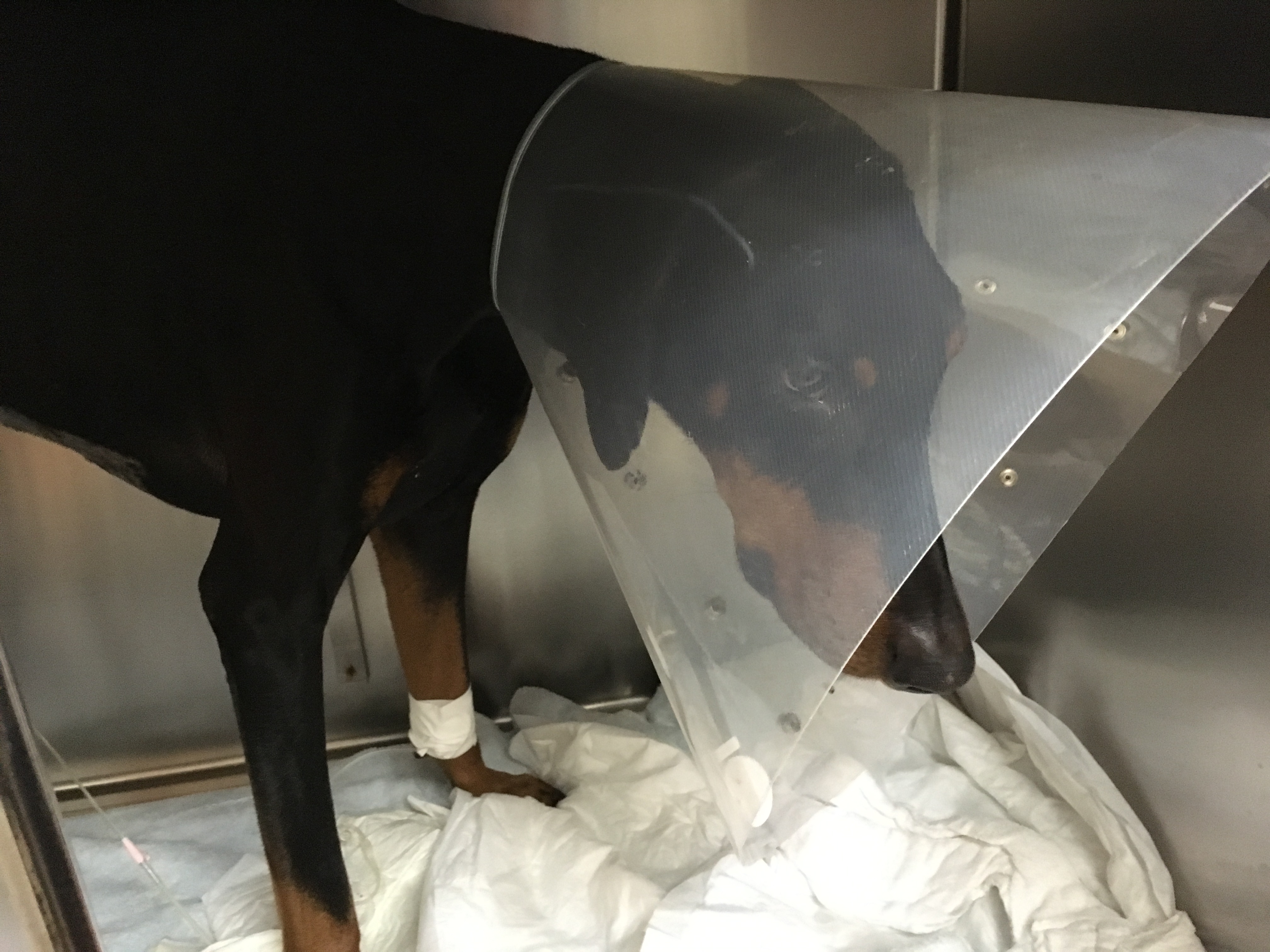 手術の次の日。病院のケージの中で点滴を受けながらただ待つ